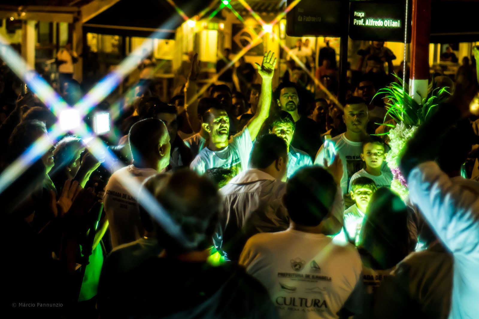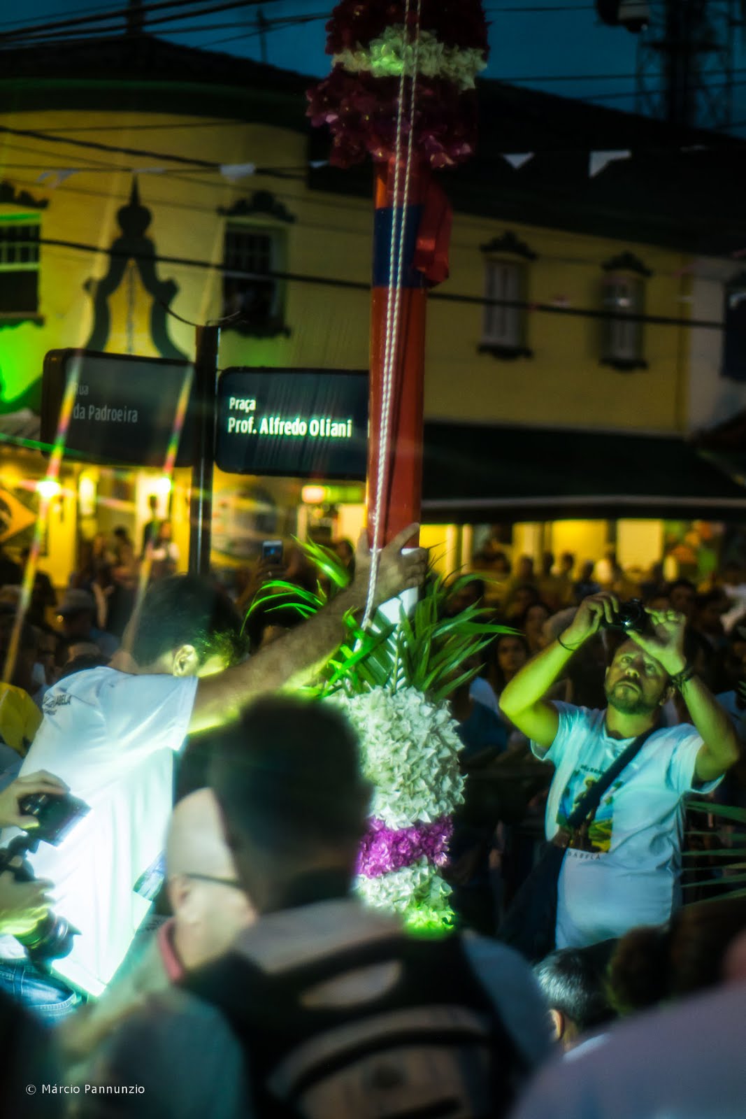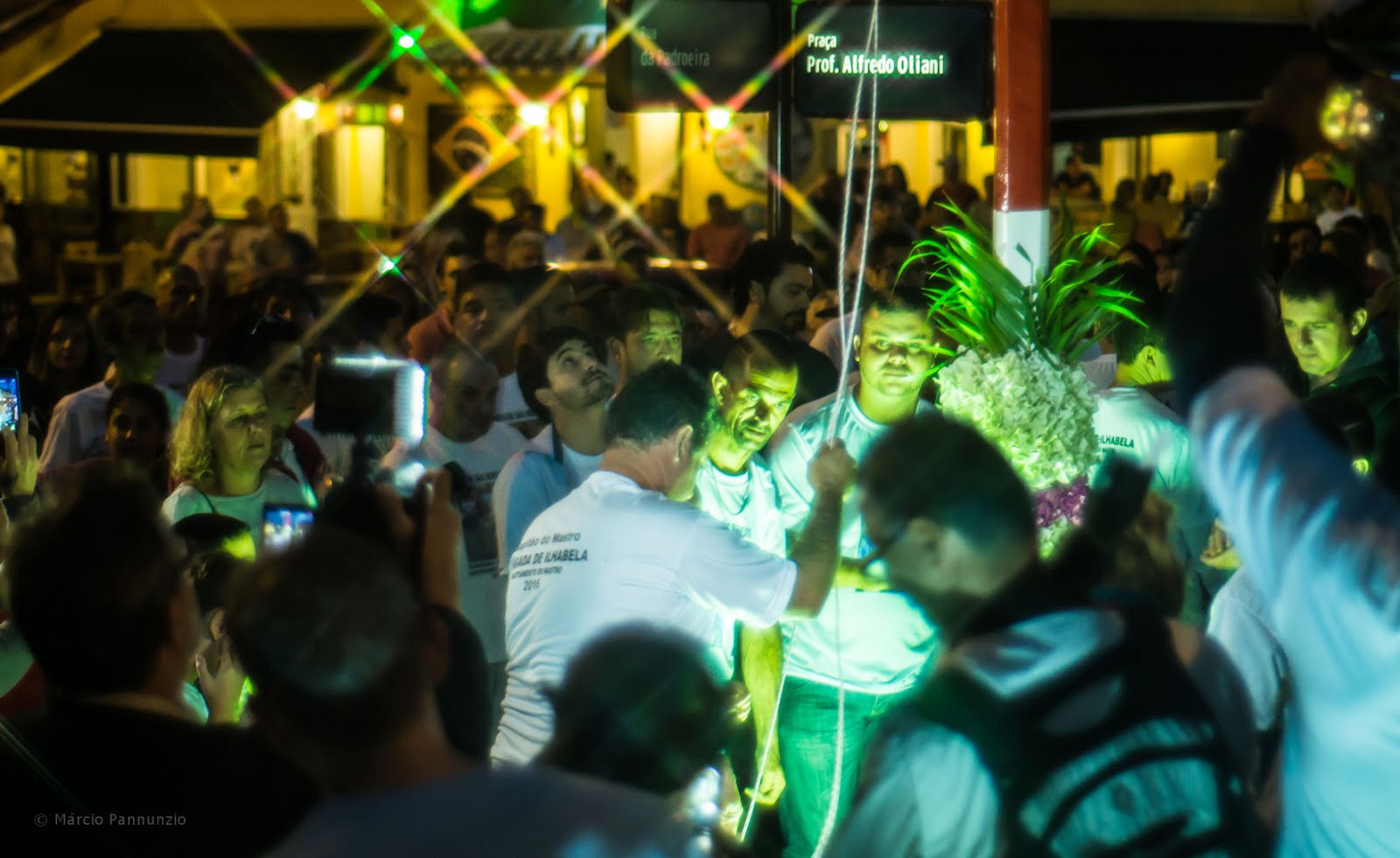 Na terceira parte da série sobre o festejo na Ilha trago o levantamento do mastro, ponto culminante da abertura dos festejos da Congada de Ilhabela na Festa de São Benedito. É preciso concentração, força e destreza para colocar o mastro em pé, para em seguida, erguer até a sua ponta o estandarte com a imagem de São Benedito. Vale perceber em várias das fotos desta coluna, o nome da praça estampado na placa de sinalização: Praça Alfredo Oliani. Alfredo Oliani, hoje, infelizmente, praticamente esquecido, mesmo pelos ilhabelenses, foi um artista notável. Devemos a ele termos uma decoração tão virtuosística na Igreja Matriz. São obras suas as esculturas da entrada, entre elas um São Benedito carregando o menino Jesus. Artista esquecido; obras mal conservadas. Nos alerta Viviane Comunale na sua dissertação “A redescoberta da obra de Alfredo Oliani: sacra e tumular”: “Com o passar dos anos, durante as manutenções feitas na igreja, essas esculturas receberam diversas camadas de cal para manter o tom branco, porém essa manutenção as vem danificando, inclusive a assinatura do artista que era feita em baixo relevo, vem desaparecendo”. Apesar disso, elas continuam a existir, encantando nossos olhos. Diferente sorte tiveram as peças do veneradíssimo escultor Frans Krajcberg, que enfeitaram a rotatória na entrada da ilha e sumiram há muito tempo, possivelmente sufocadas sob toneladas de lixo do aterro sanitário.
