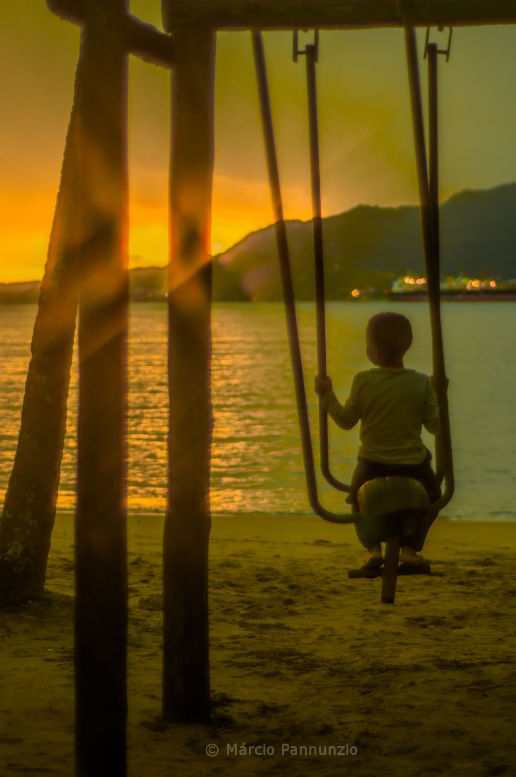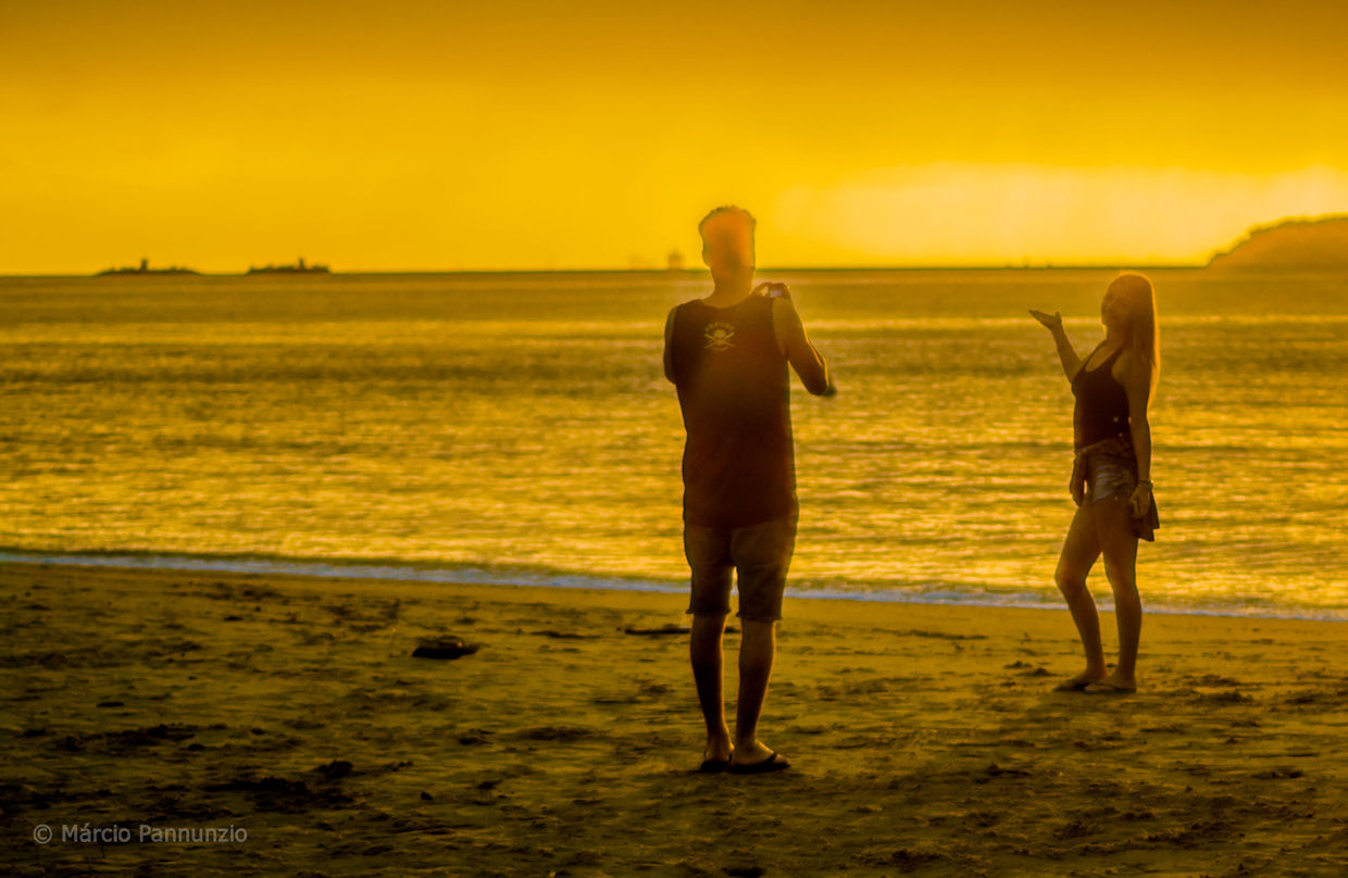 No horário de verão, a hora é depois das seis e meia. É quando o sol vai se pondo, a luz principia a acabar e num espasmo final, lança no ar um suspiro de ouro – literalmente. O dourado que tudo inunda, canibalizando as demais cores, tem uma energia antidepressiva, uma energia que nos convida a celebrar a vida com alegria. É o que estas pessoas das fotos fazem. Não há melhor remédio contra o desânimo, a náusea sartriana, do que estar nesses momentos tão fugidios sendo envolvido por essa luz mágica. Os fotógrafos chamam essas horas de “horas douradas”. Valem sim ouro, pois nos proporcionam imagens lindas. A bem dizer da verdade, duram uma fração tão diminuta de tempo, que não deveriam ser chamadas de horas, mas de instantes. E as horas douradas na praia do Perequê, então, nos fazem concordar com o acerto do nome de Ilhabela.
