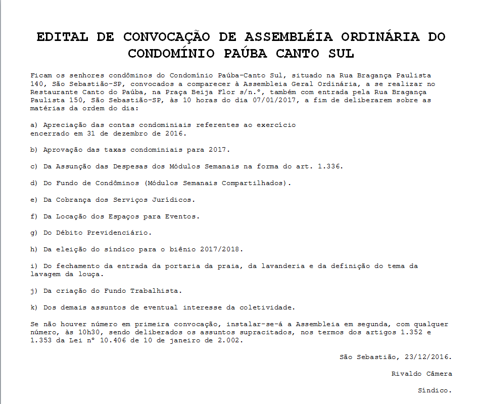 DE CONVOCAÇÃO DE ASSEMBLÉIA ORDINÁRIA DO CONDOMÍNIO PAÚBA CANTO SUL