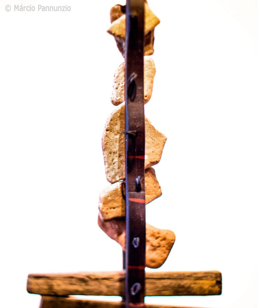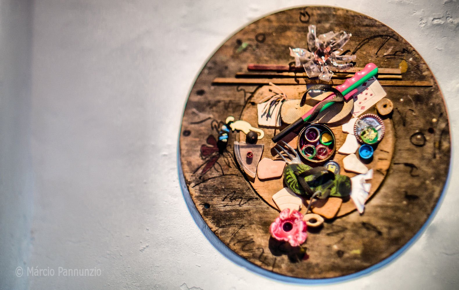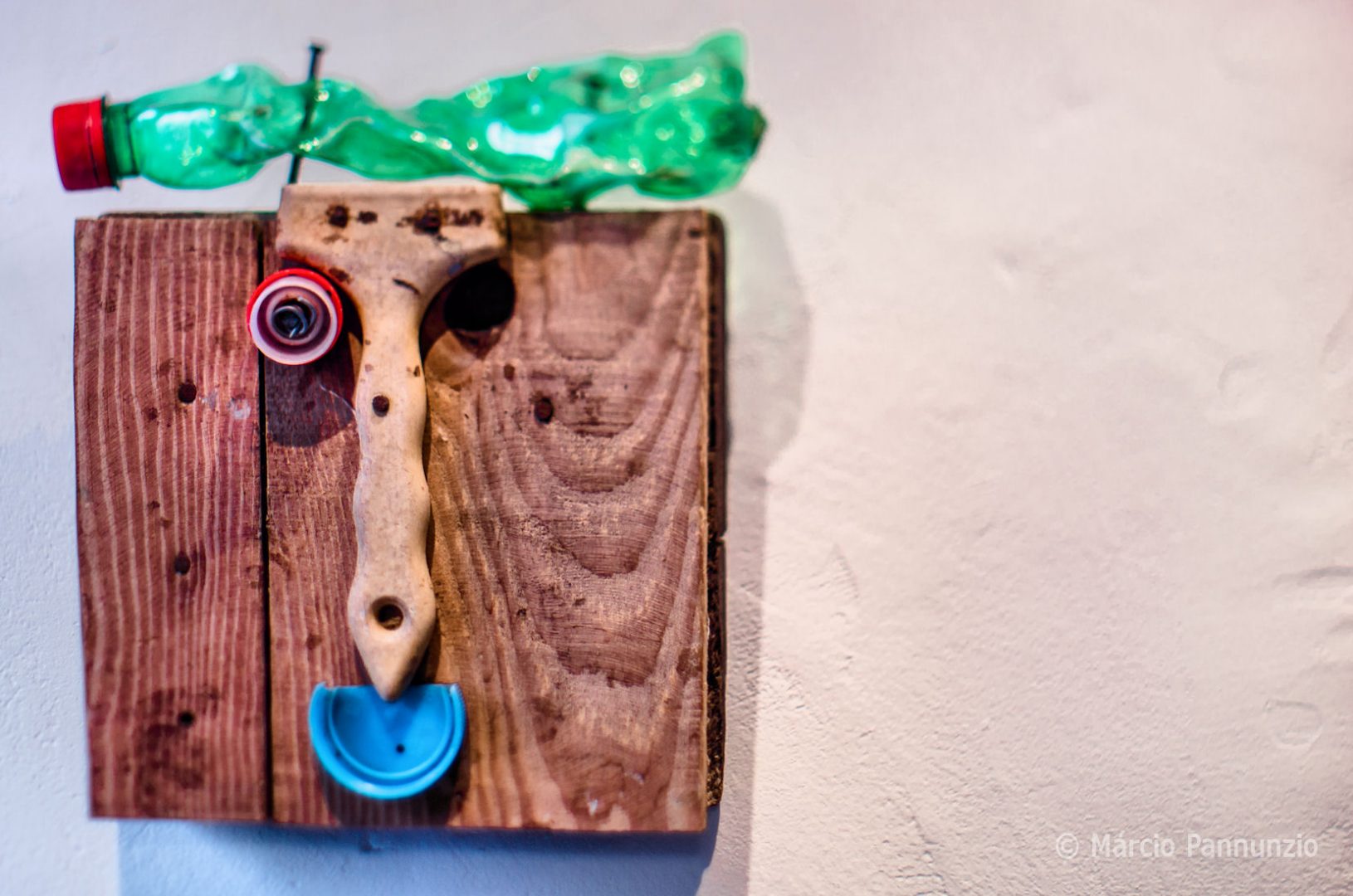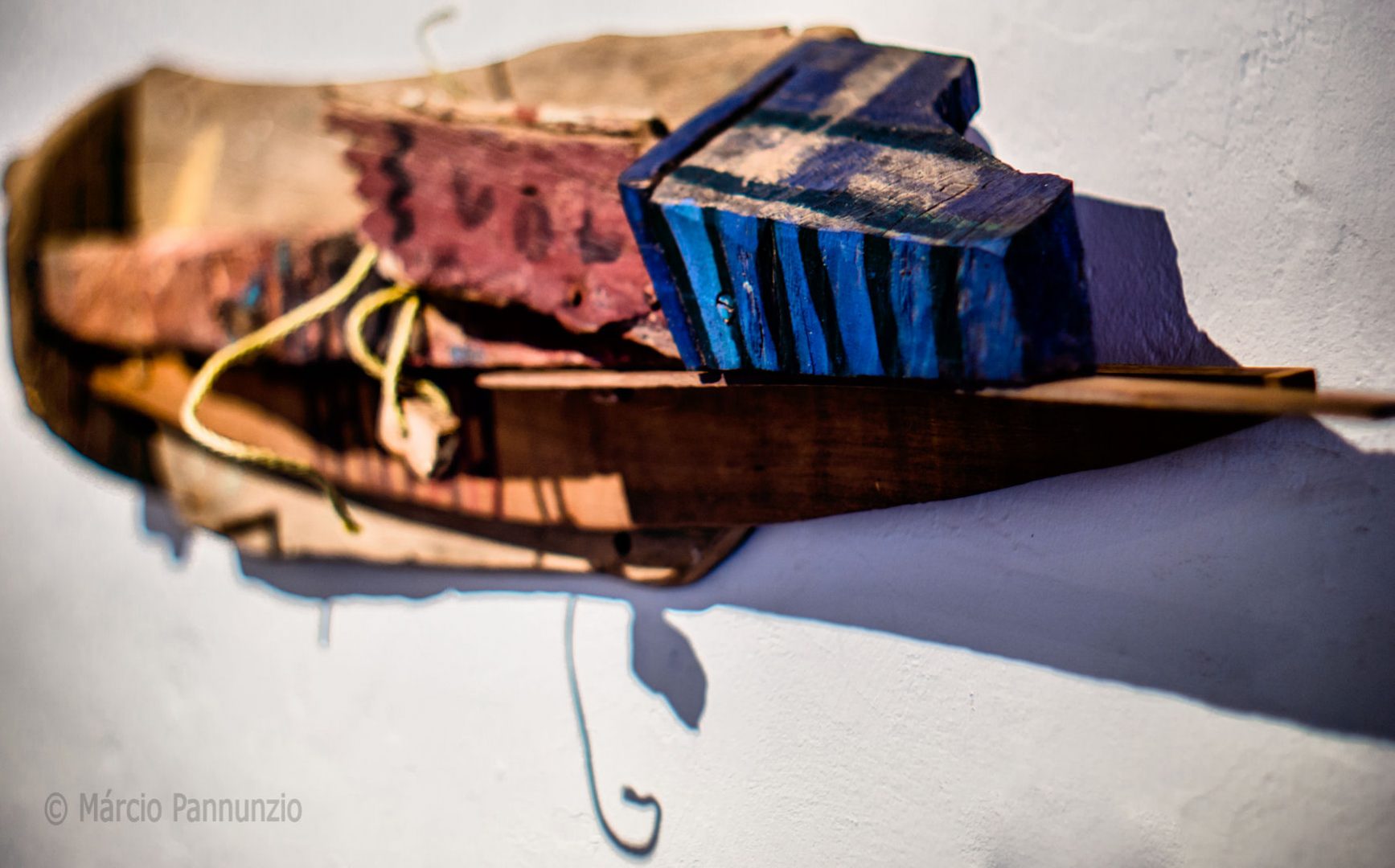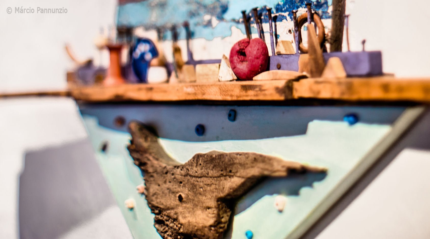 Seu olhar de coletor amoroso resgata da morte fragmentos de mundo que as outras pessoas simplesmente não veem. São pedaços de madeira, plástico, sisal, granito, metal … Tem o dom de perceber nessas diminutas peças, sobreviventes. Resgata a dignidade dessas coisas abandonadas, amaldiçoadas a serem esquecidas, enterradas.