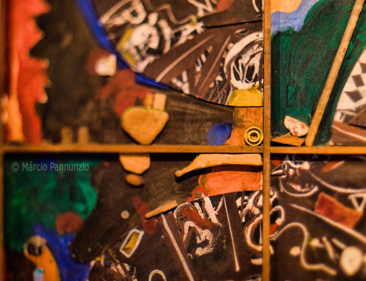 Então, vale a pena olhar atenta e vagarosamente as obras de Pacheco. Distinguir do que são feitas. Perceber a singularidade de cada uma das peças que as compõem. Não há, nesse processo, como não se encantar com o engenho, com a criatividade do artista. Com a sua incrível capacidade de combinar cacos, estilhaços que parecem nada ter a ver uns com os outros. Harmonizá-los estabelecendo conexões não percebidas, montando um quebra-cabeça intrincado.