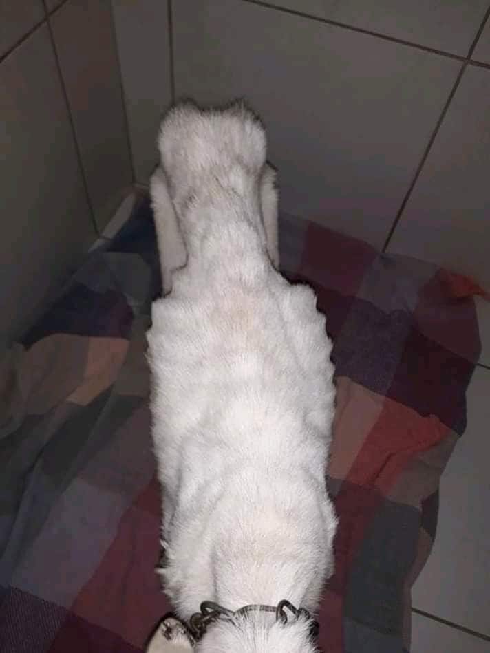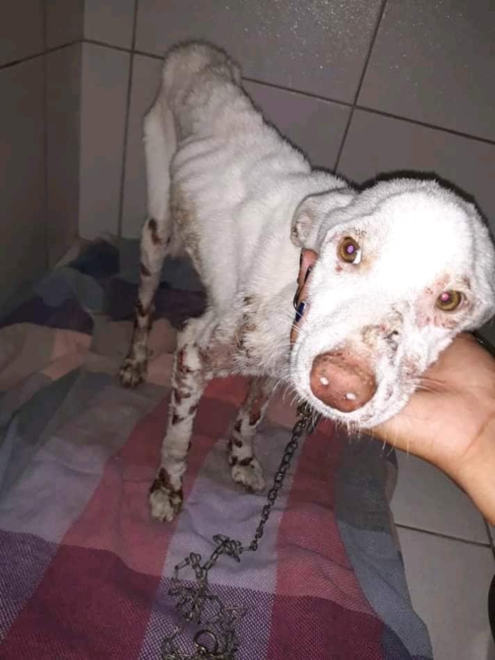 “Ele foi deixado ali para morrer. O animal está com a doença do carrapato, desnutrido, com uma infecção muito grave na pele, muitas feridas e hematomas resultantes de agressão”, conta Elisa.