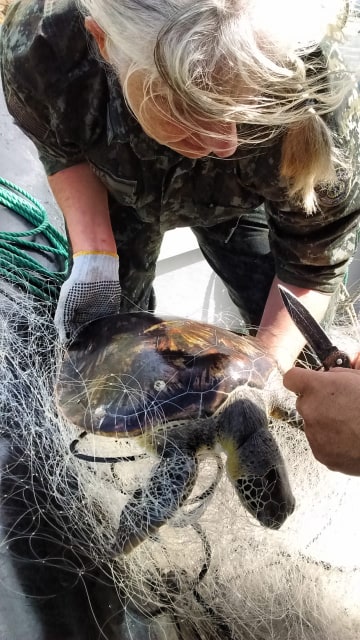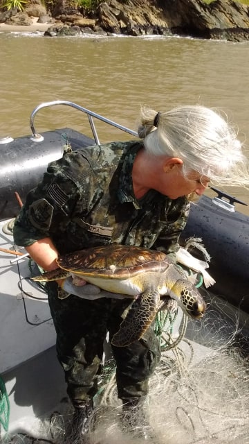 Uma tartaruga verde, espécie que corre o risco de extinção, estava enroscada em uma rede de pesca na região da baía da Enseada, em São Sebastião, e foi resgatada pela equipe da Polícia Militar Ambiental, nesta terça-feira (4). Peixes de diversas espécies ainda vivos também foram devolvidos ao mar.