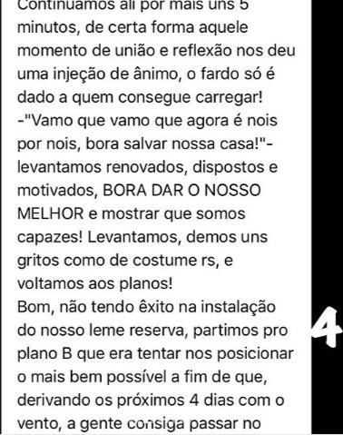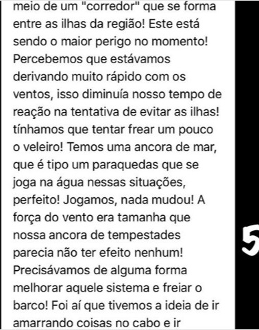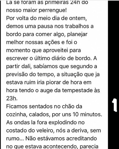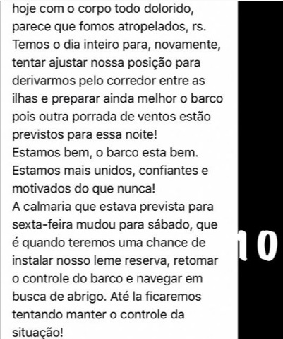 Em uma das postagens Lucas relata: “lá se foram as primeiras 24 horas do nosso maior perrengue. Por volta do meio-dia demos uma pausa nos trabalhos a bordo para comer algo, planejar melhor nossas ações e aproveitar para escrever o último diário de bordo”.
