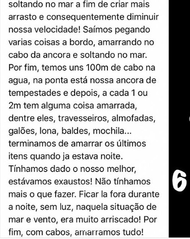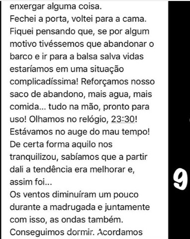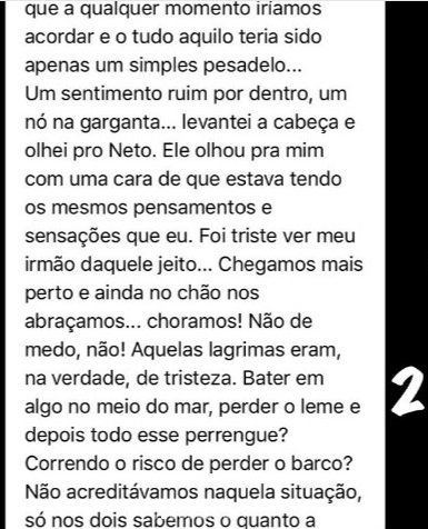 “…choramos! Não de medo, não! Aquelas lágrimas eram, na verdade, de tristeza! Bater em algo no meio do mar, perder o leme e depois todo esse perrengue? Correndo o risco de perder o barco? Não estávamos acreditando naquela situação”.