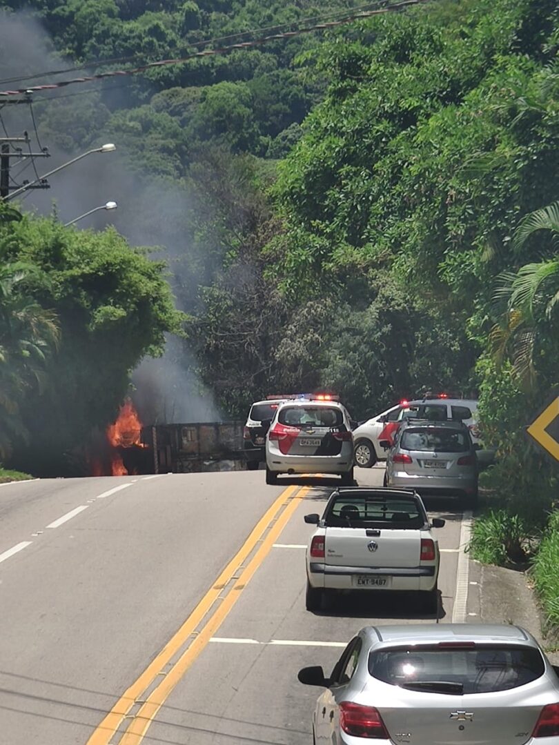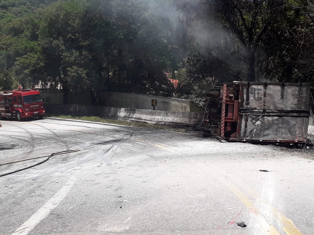 Um caminhão que transportava cloro tombou e pegou fogo no km 157 da Rio- Santos (SP-55), no trecho de Maresias, costa sul de São Sebastião. O acidente aconteceu na manhã desta quarta-feira (29) e as primeiras informações indicam que o cloro já chegou ao mar. Não houve feridos.