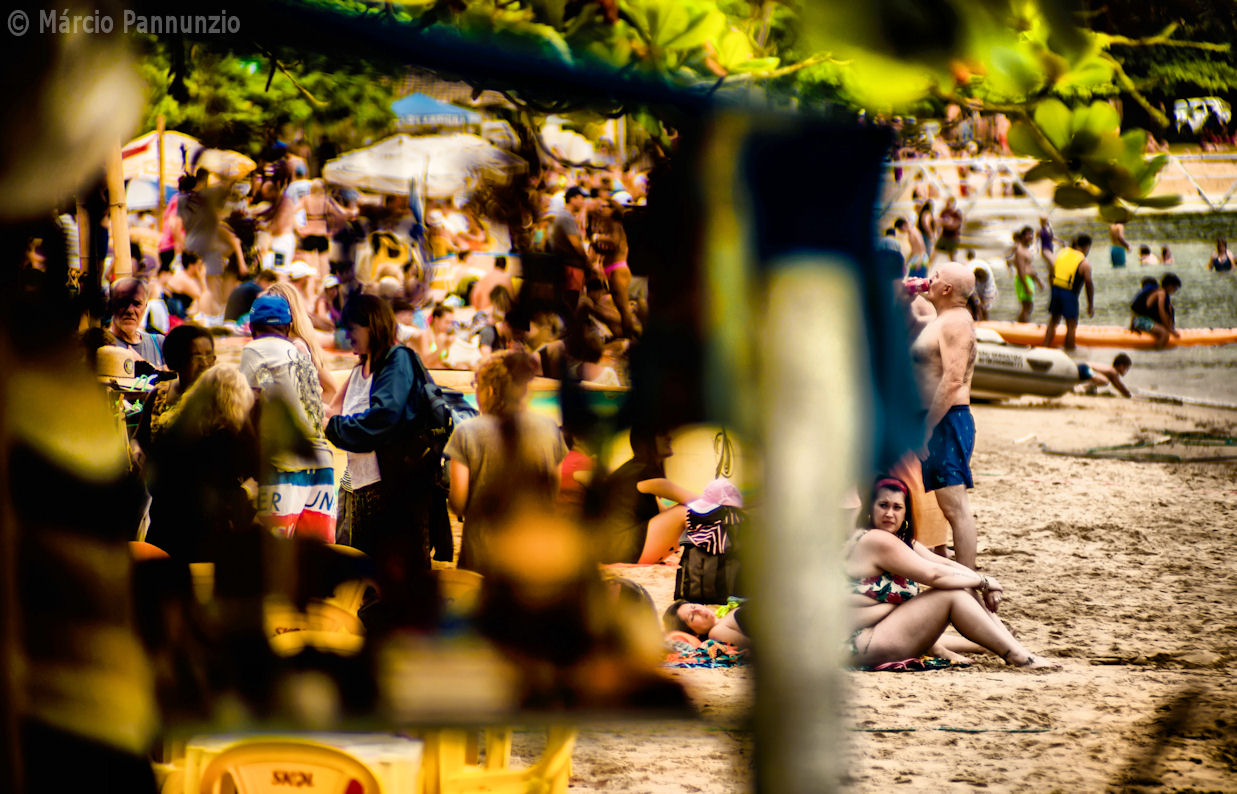 É uma multidão se digladiando por um espaço na areia e um espaço num mar repleto de embarcações de recreio despejando n’água, elas igualmente como os residentes, merda e urina com o acréscimo do óleo diesel e da gasolina. Talvez uma outra das mil maravilhas venha a ser esse cheiro nauseante de merda, gasolina e óleo que juntamente com o suor de tantos corpos empesteia o ar sem brisa que o espante.