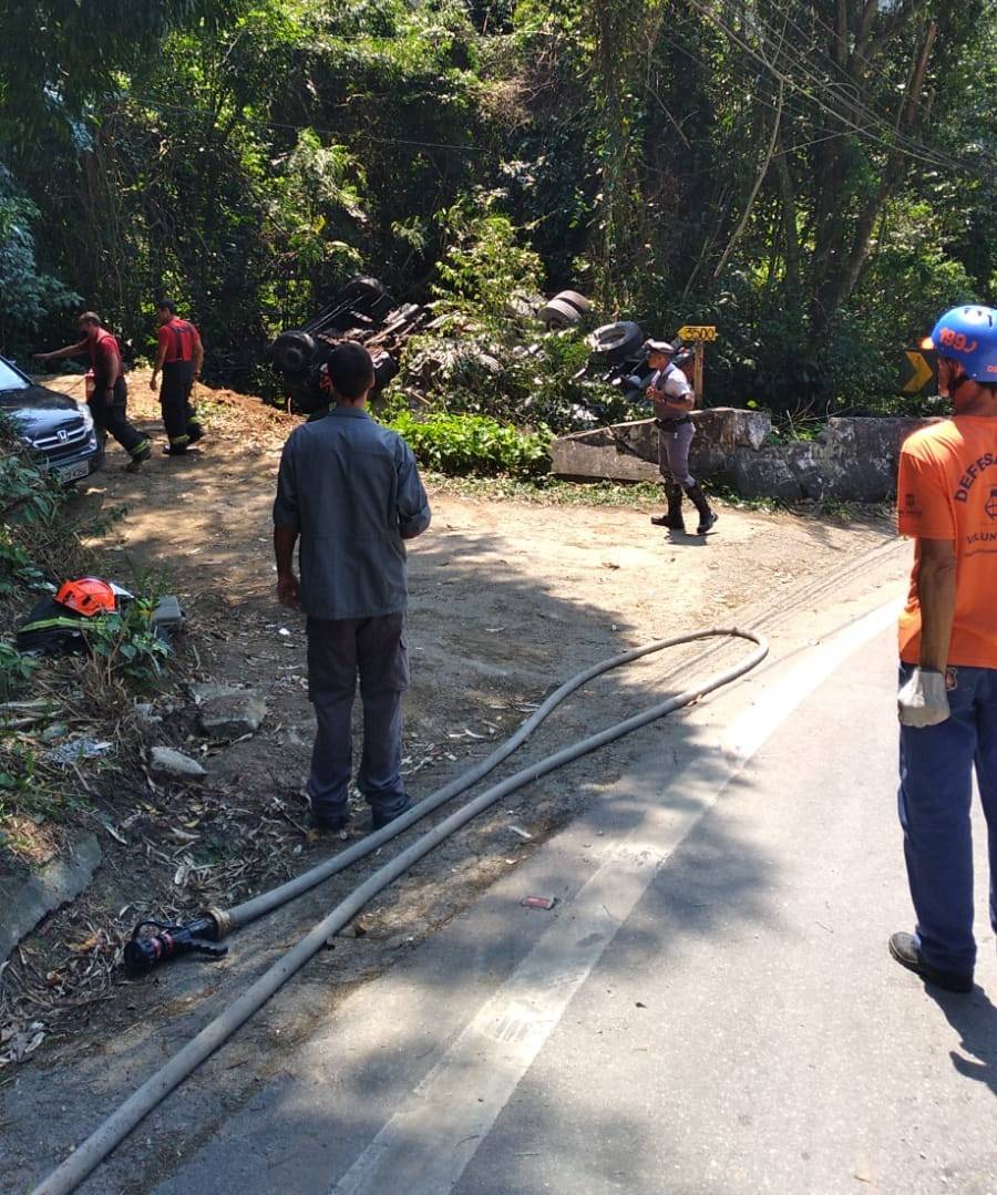 Um caminhão carregado de diesel capotou, na manhã desta segunda-feira (20), e causou grande quantidade de vazamento do combustível na rodovia Rio-Santos, na altura da serra de Maresias, Km 157, em São Sebastião. A pista foi interditada nos dois sentidos por conta do risco de explosão.