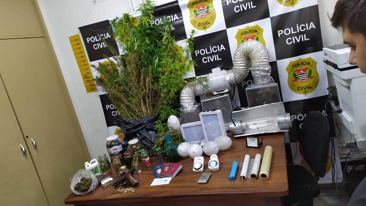Segundo a polícia, foram encontrados mais sete potes de maconha com álcool, mistura que serve para extrair o THC da droga para a produção de haxixe, e fertilizante internacional para cultivo de maconha.