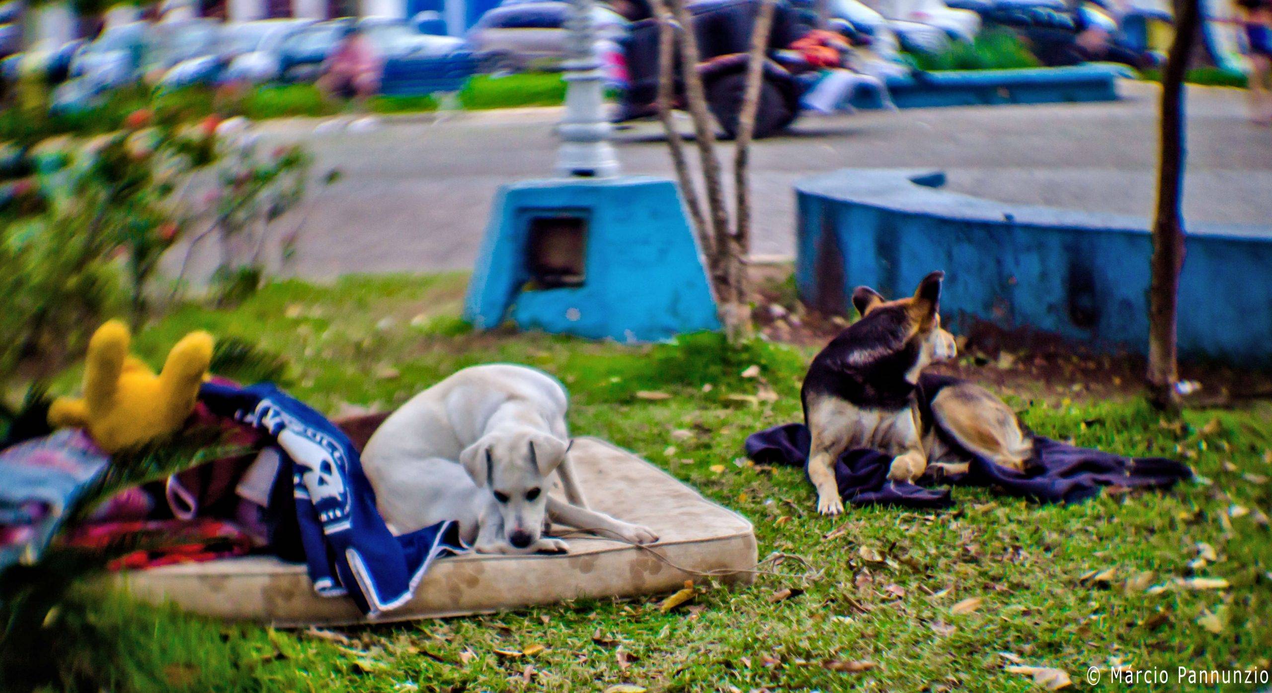 Num instante a calçada e a rua inteira em frente se atulhou de papelão, colchões velhos, cobertores, carrinhos de supermercado transbordando de tanta tranqueira e duma gente sem banho e muita dela de pele escura e essa gente toda ainda acompanhada por muita cachorrada. Não cachorrada dos aporofóbicos que os querem bem longe, vale esclarecer, mas cachorrada mesmo: cachorros e cadelas sem eira nem beira, sem lar que os queira.