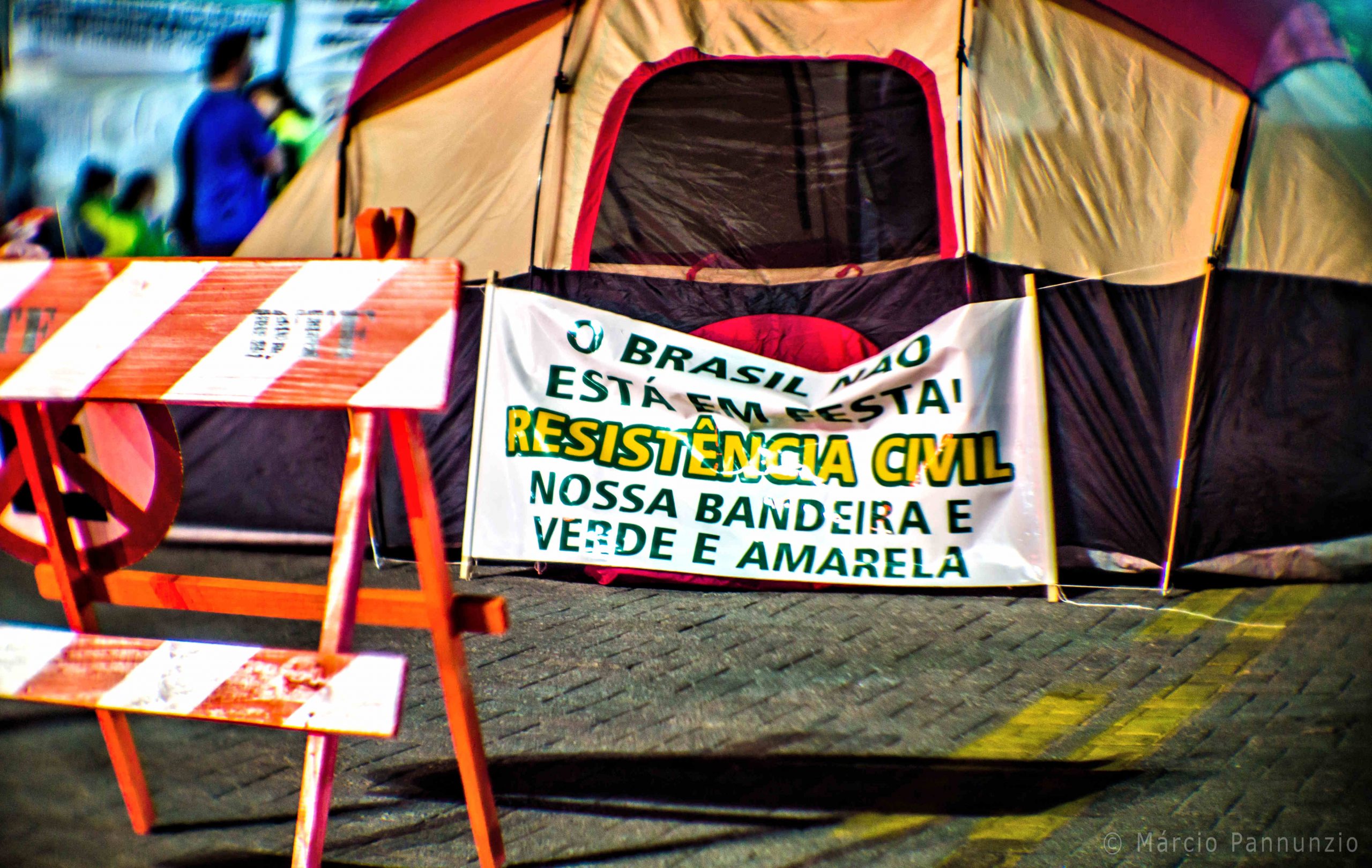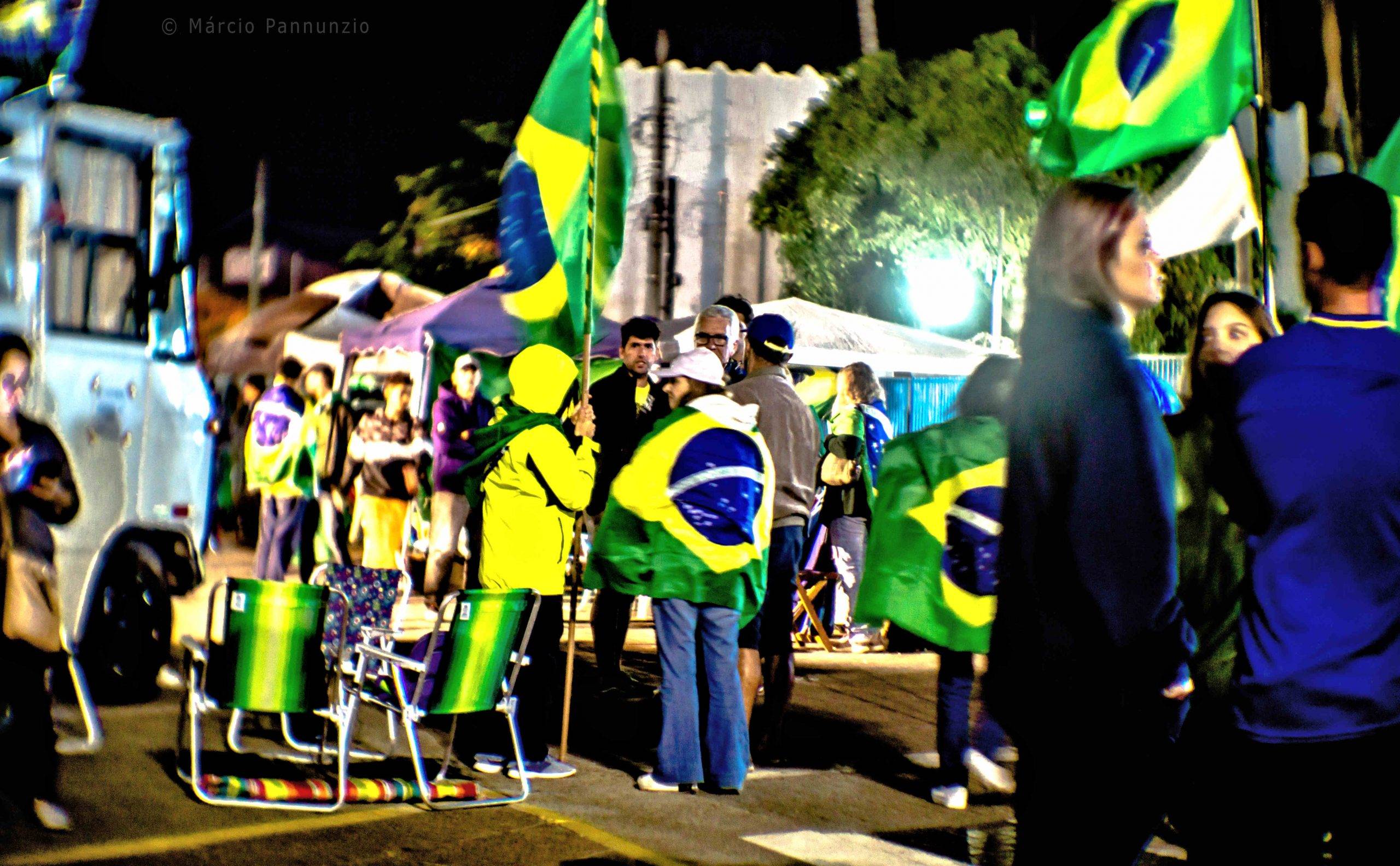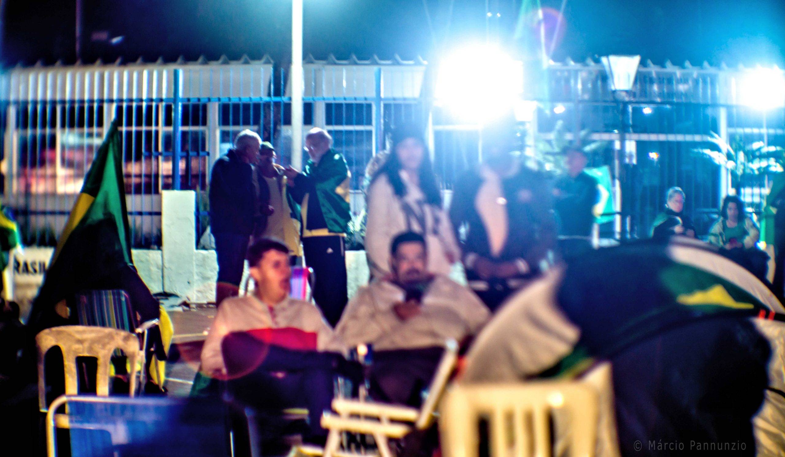 Desde a proclamação do resultado do segundo turno das eleições, um grupo que parece mais ala de escola de samba por estar todo fantasiado de verde amarelo, interditou a rua da praia e dificultou o acesso à Delegacia da Capitania dos Portos. Viaturas da PM que poderiam estar percorrendo a cidade em patrulhamento, ficaram lá estacionadas. Populares que não professavam a mesma fé da turba correram o risco de serem hostilizados. Lá dentro tinha barraca dessas expostas com destaque em loja chique de camping, tinha tenda pra se alimentar, tinha cadeira e espreguiçadeira com fartura e tinha até caminhão zero bala parecendo carro alegórico de tanta bandeira e pano colorido o cobrindo. Podia bem estar de serviço fazendo entrega, mas ficou lá parado com alguém pagando por isso.