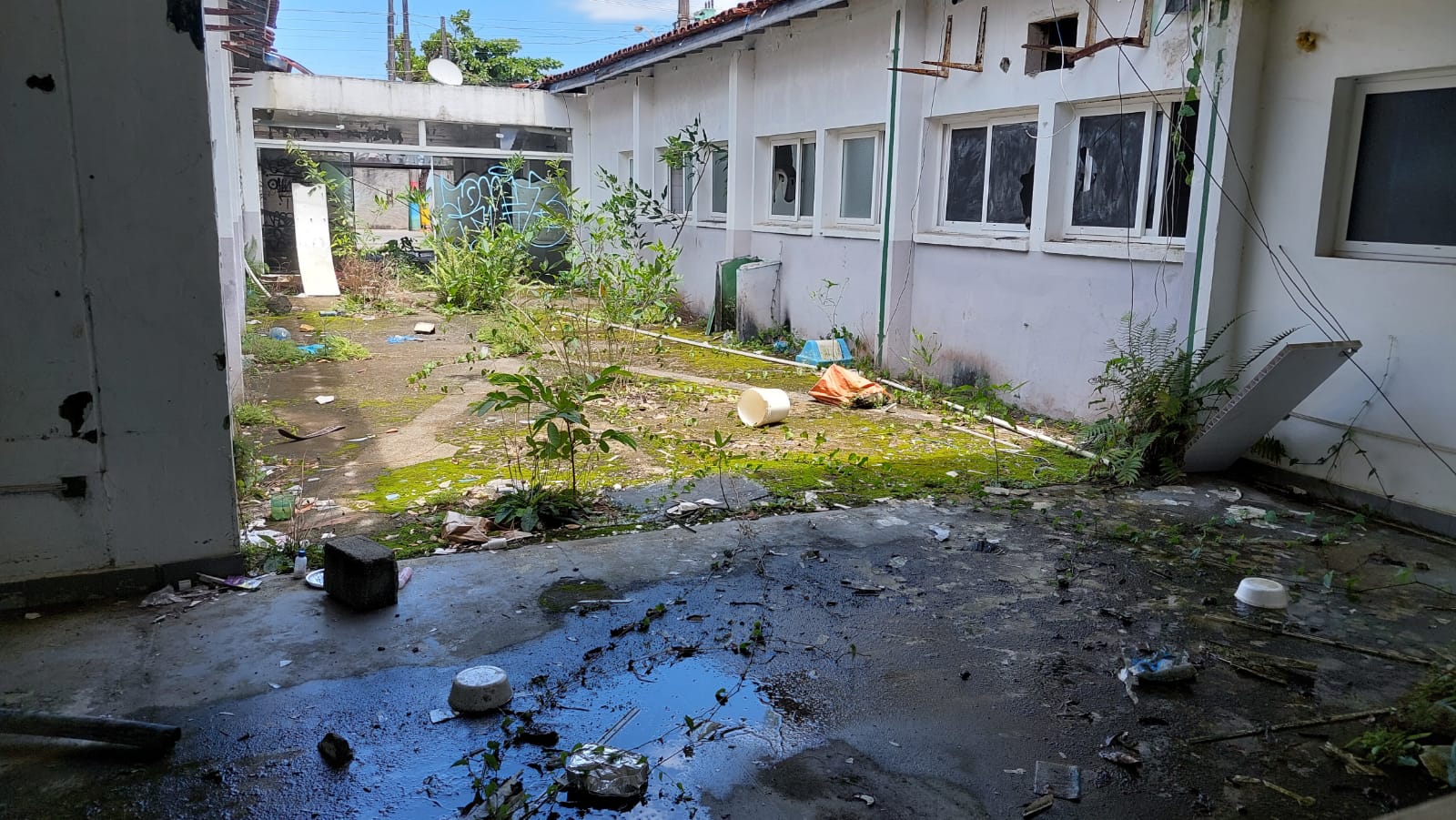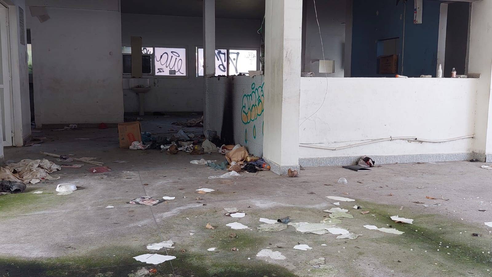 Objetos pessoais e embalagens de alimentos indicam que o local esteja sendo frequentado por moradores em situação de rua. As pichações estão por toda a parte, e o matagal tomou conta da área externa.