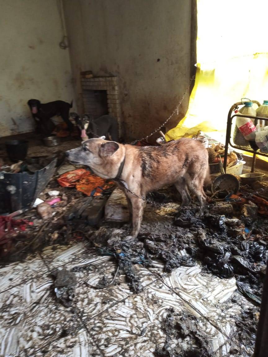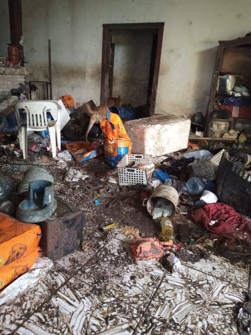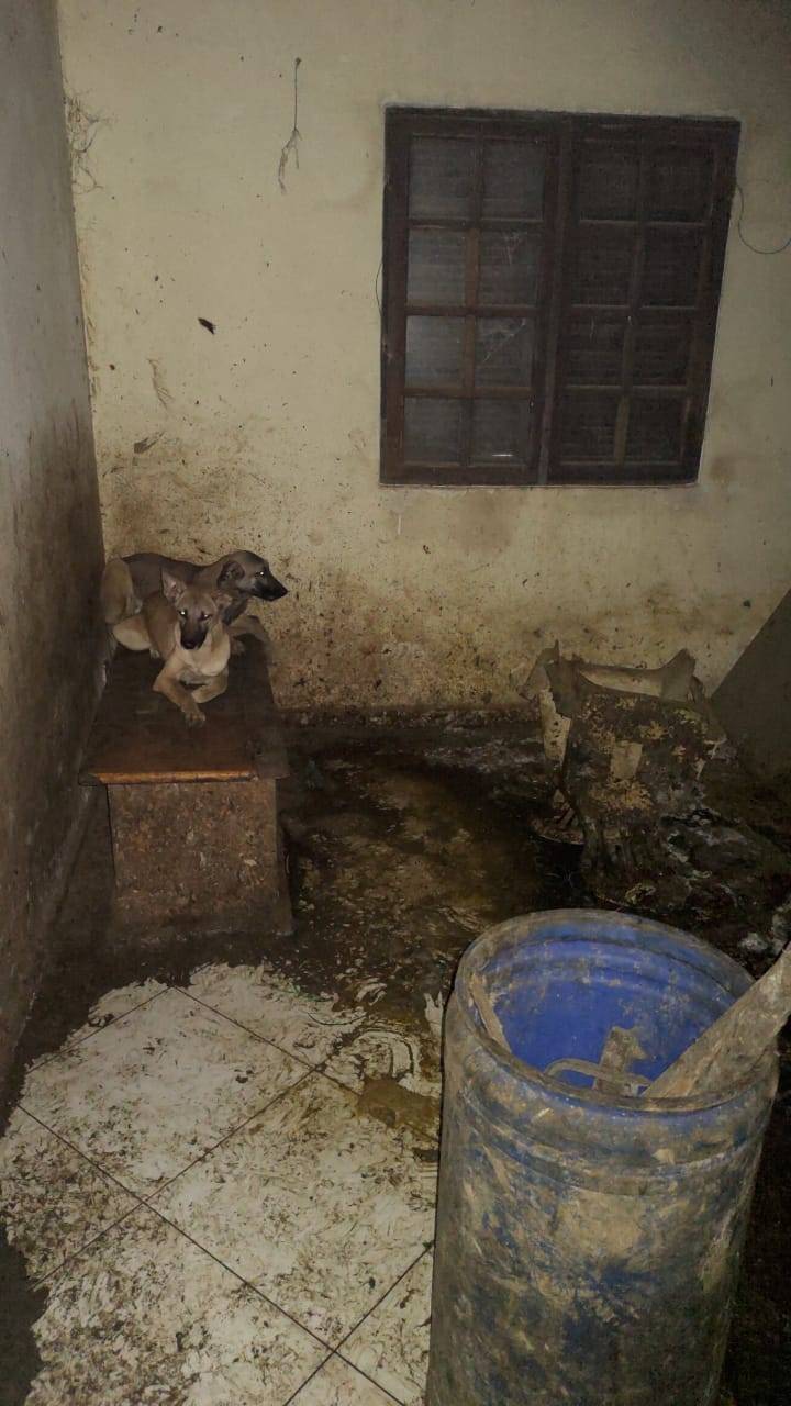 Com o flagrante, eles conseguiram entrar sem a permissão da dona e encontraram 17 cães dispostos em diversos cômodos, sem alimento e água, com acúmulo de fezes, sujeira, urina e utensílios domésticos.