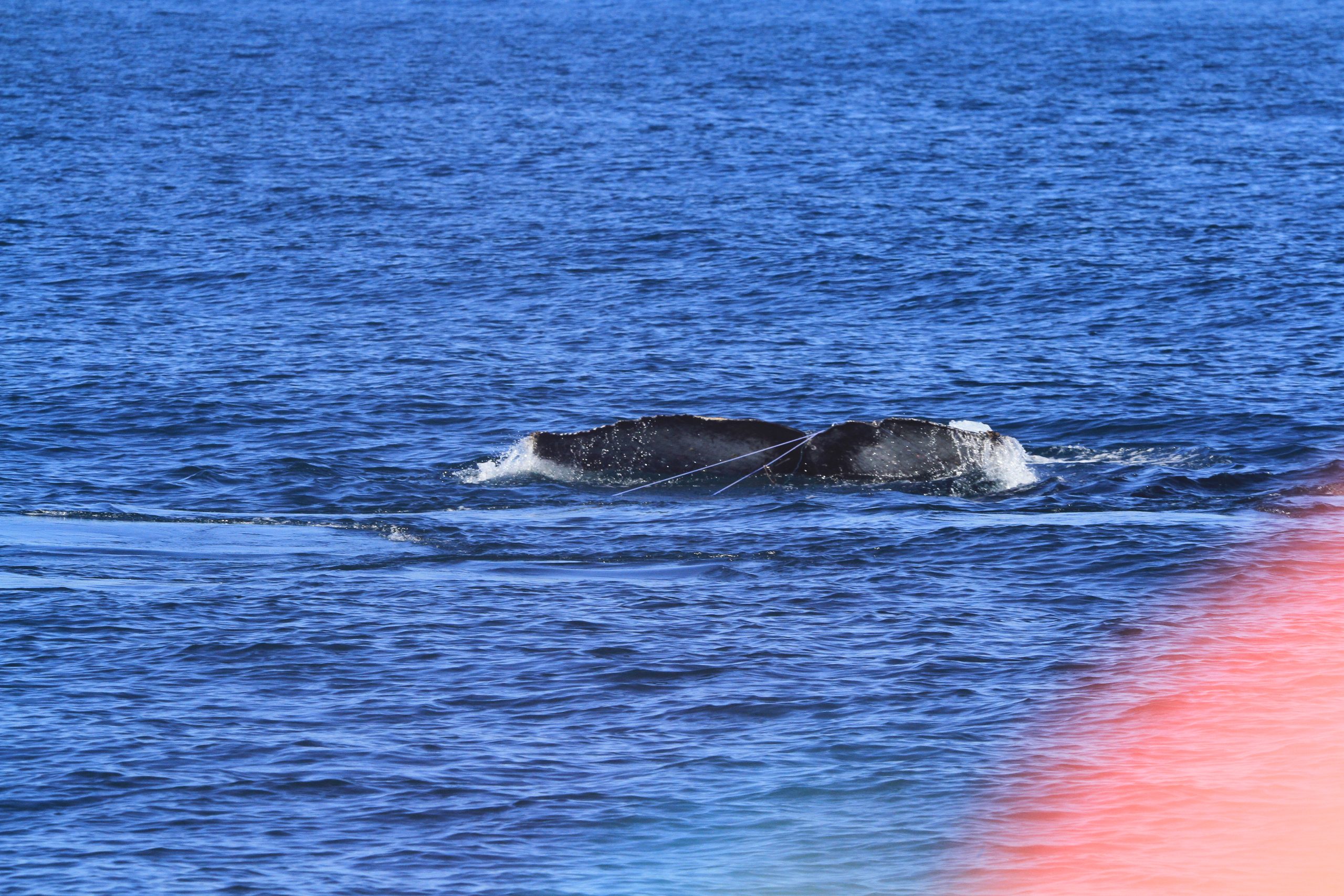 O animal estava arrastando um cabo de nylon com poita (peso para manter o petrecho no fundo), que estava preso a sua cauda, medindo cerca de 80 metros, e espessura de 8 a 10 mm. Esse é um tipo de petrecho utilizado em pesca de espinhel – formado pela linha principal, linhas secundárias (alças) e anzóis.
