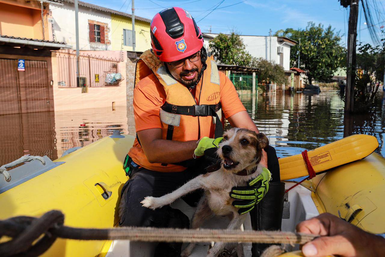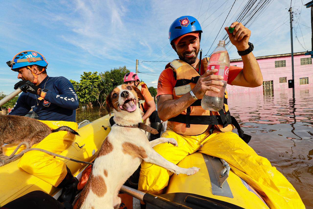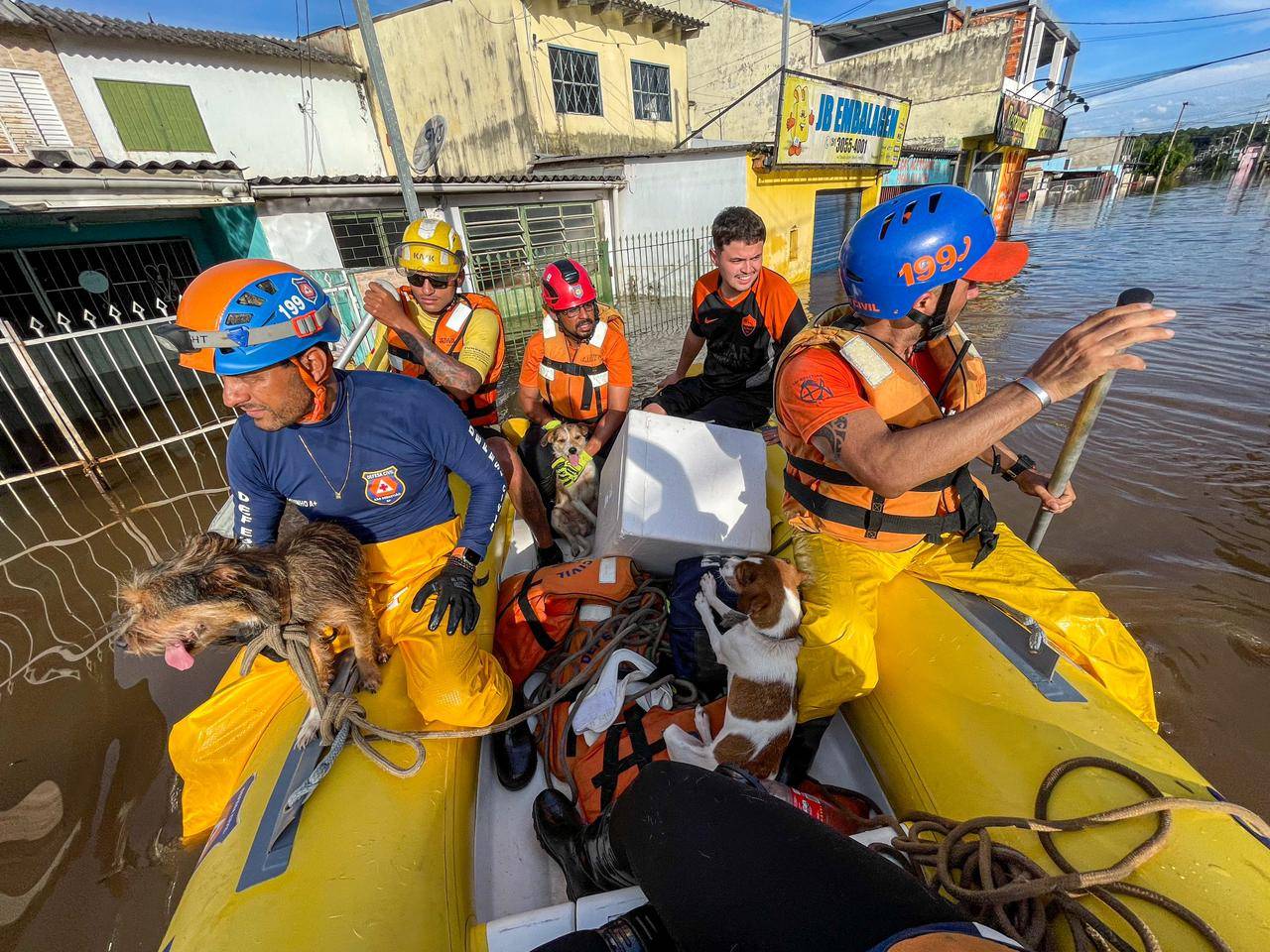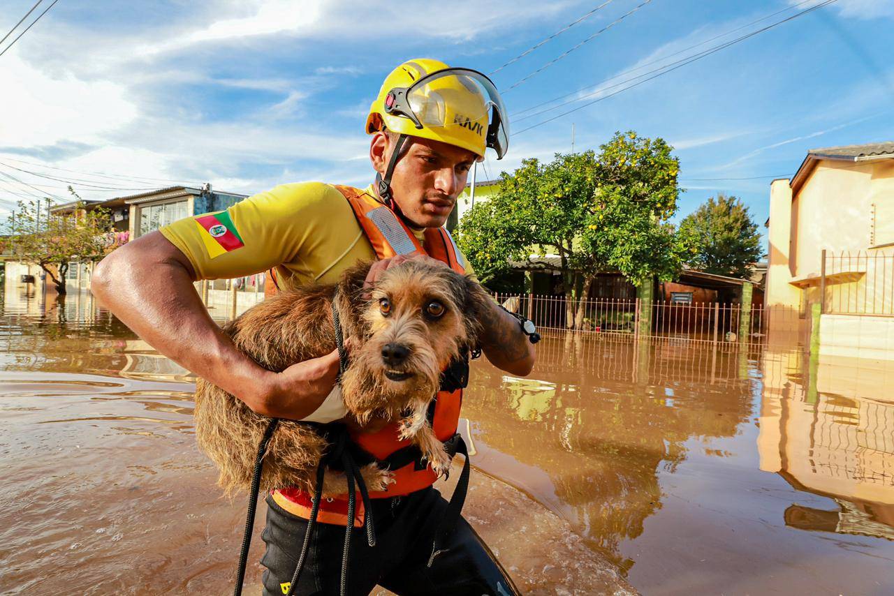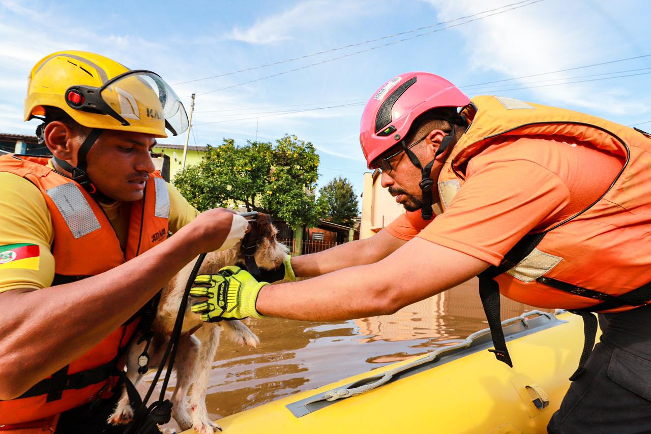 Um dia após a chegada ao Rio Grande do Sul, a equipe da Defesa Civil de São Sebastião realizou um resgate emocionante de três cachorros que estavam abandonados no segundo andar de um sobrado na cidade de Guaíba, a 40,2 km de Porto Alegre.