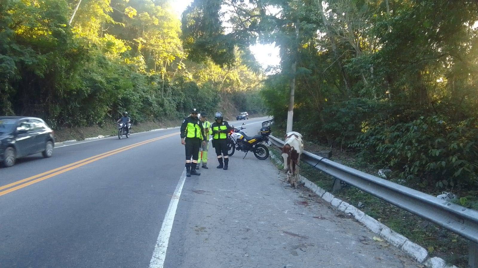 O acidente foi antes das 5h, pois uma motorista relatou que passou por volta desse horário e o animal já estava na pista.