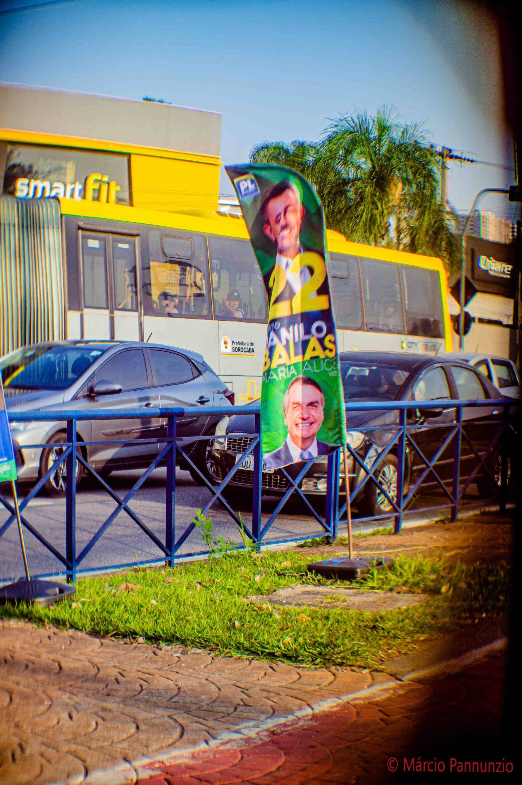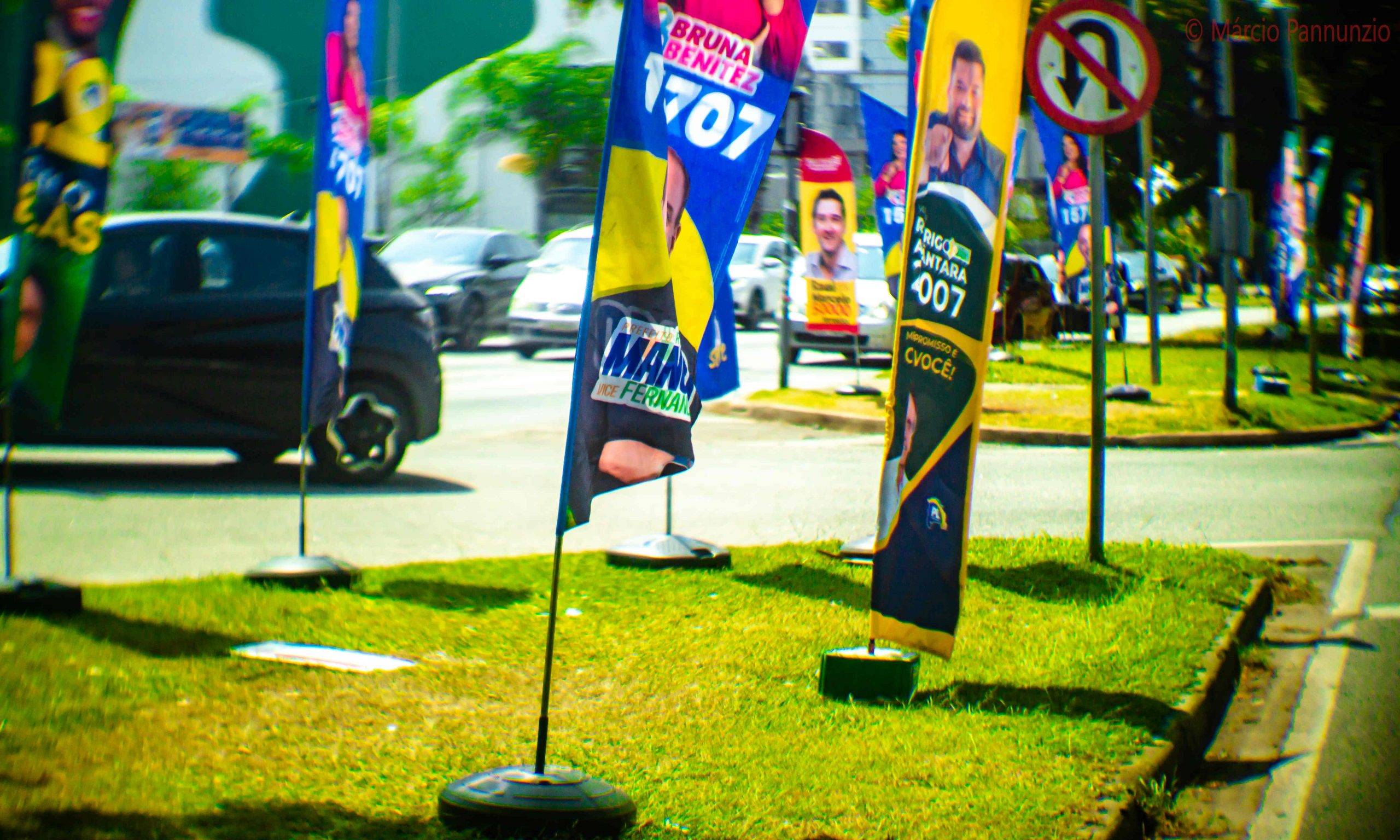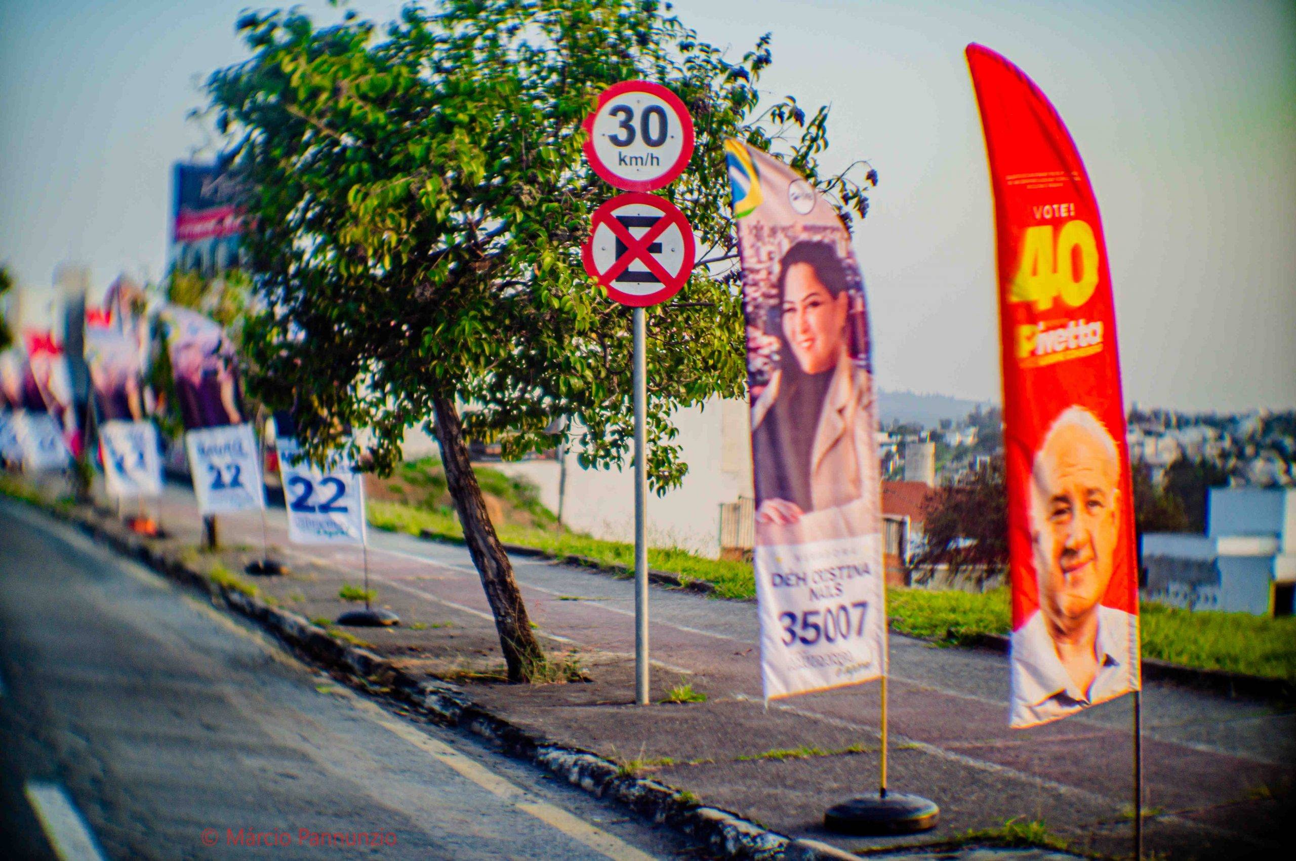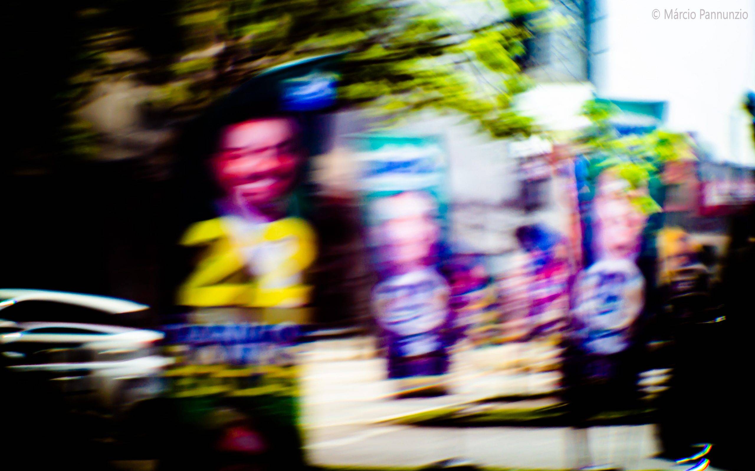 Pois agora uma legião de faces não em preto & branco fora de foco tremendo em listras horizontais dentro de tubos encaixotados, mas faces coloridas maquiladas e muito fotochopadas, sequestram as ruas e cruzamentos de todos os lugares. Marcando outra expressiva diferença, desta feita, todo dentes nos gargalham flamejando nessas bandeiras de vento que o estrangeirismo lambe-botas norte-americanas chama de windbanners. Bem poderiam vender pasta de dente, fio e escova dental, implante dentário de tanto escancarar riso nos prometendo entrada no Jardim do Éden quando, infelizmente, boa parte se eleita e poderosa poderá sim colaborar para destruir as poucas conquistas civilizatórias que demandaram enorme esforço pra serem alcançadas com a redemocratização, promovendo retrocesso na cultura, educação, saúde, – na gestão municipal, resumindo – , de cidades brasileiras.