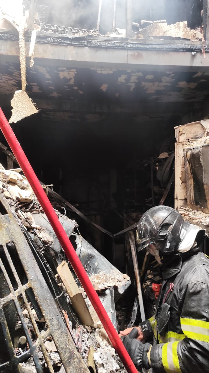 O fogo se alastrou verticalmente com rapidez, atingindo o mezanino do imóvel, área utilizada como depósito de bebidas e materiais diversos. A situação agravou o risco estrutural do prédio.
