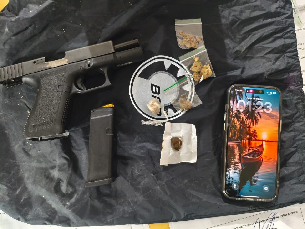 O caso ocorreu por volta de 1h e após a colisão, os policiais abordaram o condutor e encontraram uma pistola Glock G25 com numeração raspada, além de 14 munições intactas no carregador. Na busca, os agentes também localizaram uma pedra de crack, porções de skunk e de haxixe.