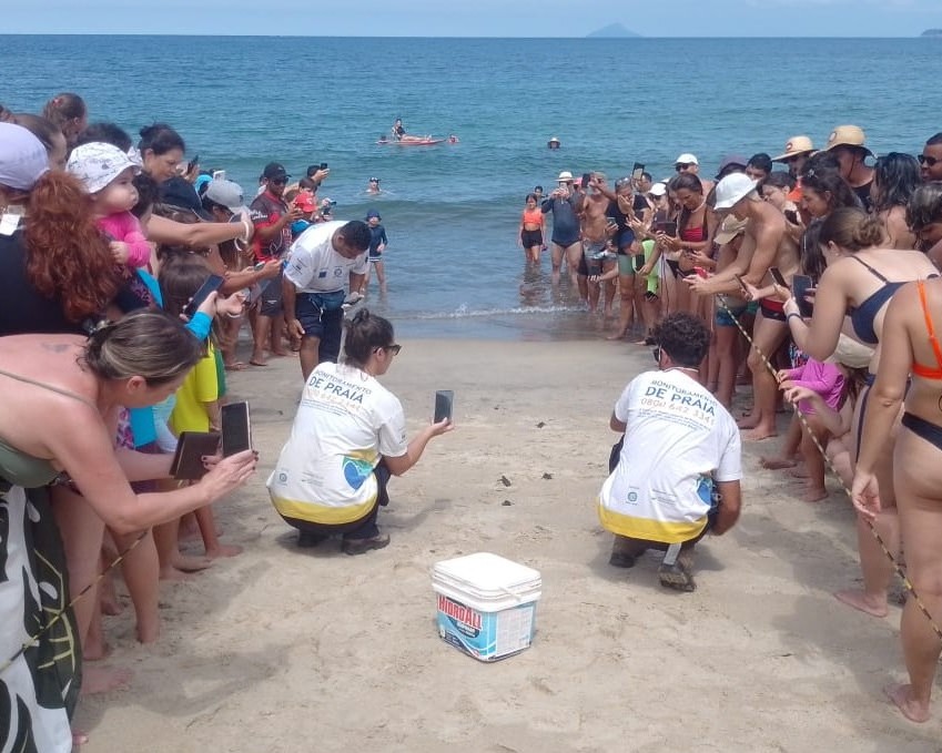 Um casal de caiçaras, que trabalha com vendas no local, percebeu a cena rara com quatro filhotinhos, e acionou ajuda para isolar a área e permitir que os filhotes chegassem ao mar em segurança.