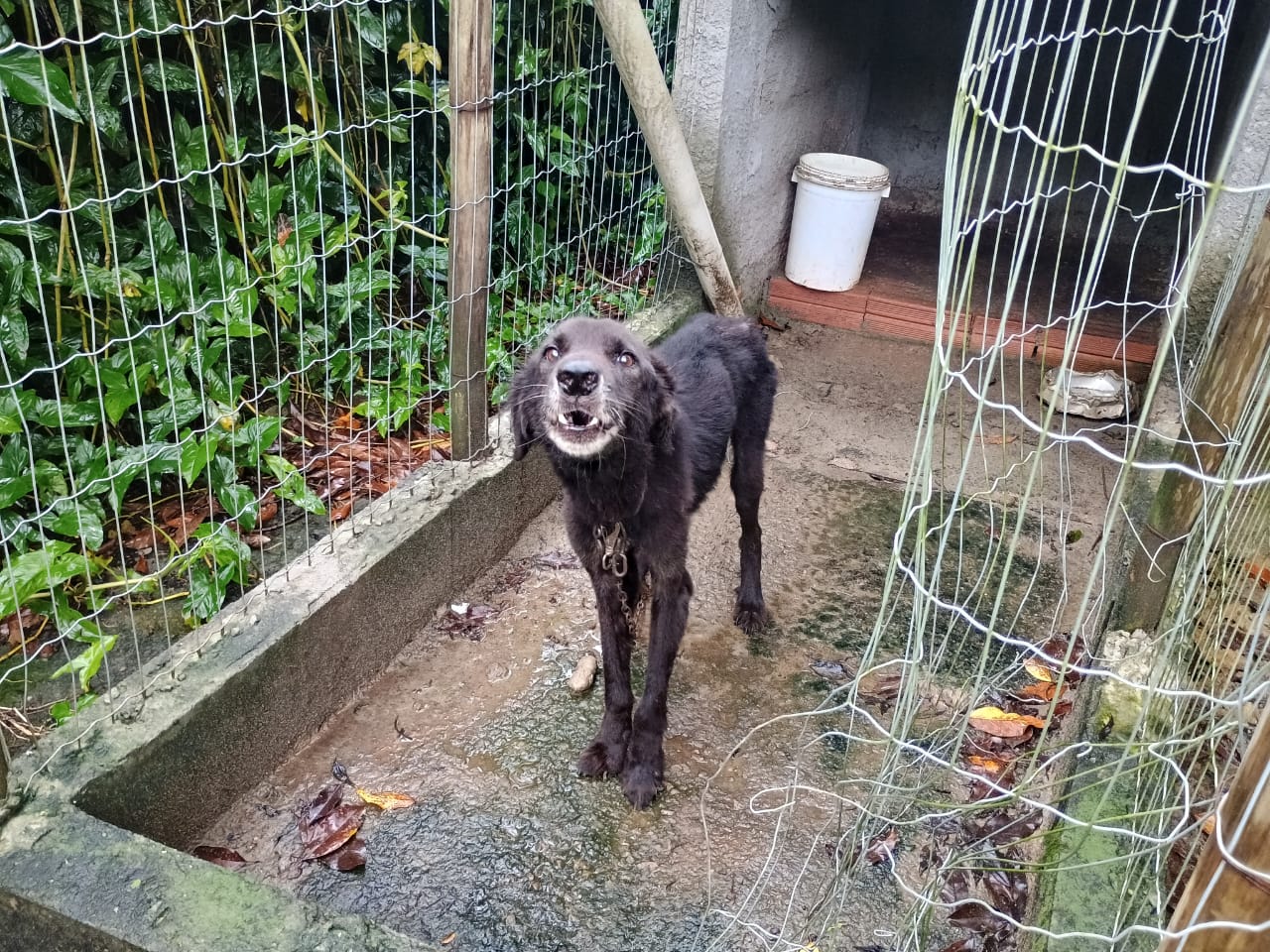 Ao chegarem ao endereço, os agentes da Atividade Delegada Ambiental encontraram três cachorros adultos, sem raça definida, vivendo em um cenário de privação. Os animais estavam presos a correntes curtas, o que limitava severamente seus movimentos, e não possuíam acesso a água limpa ou alimentação adequada.